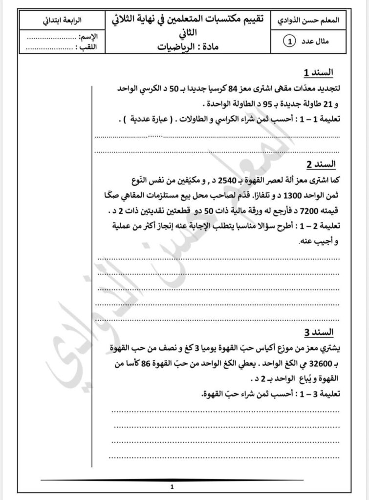 إمتحانات مميزة مرفقة بالإصلاح المدقق في الرياضيات و الايقاظ لتلاميذ السنة الرابعة 4️⃣ الثلاثي الثاني mathsc4