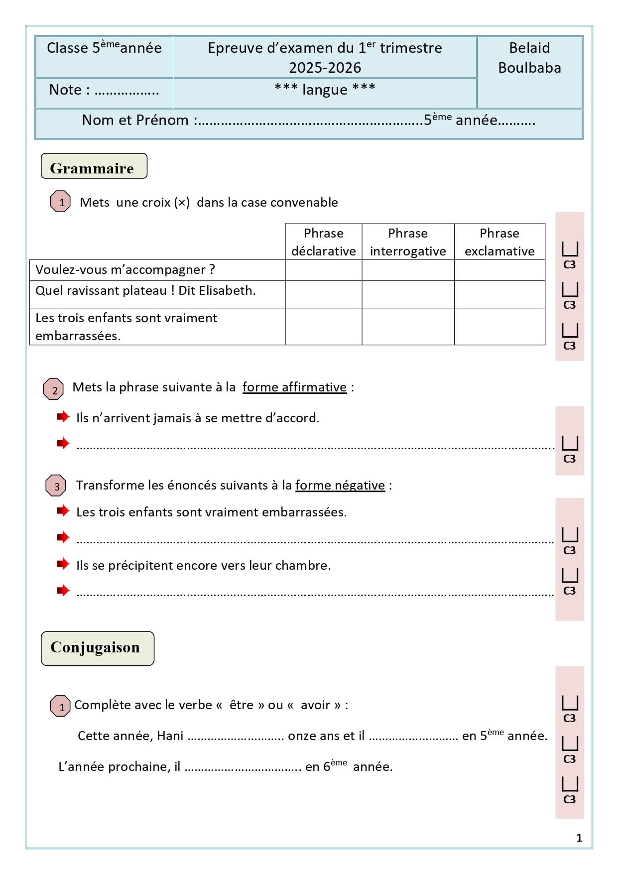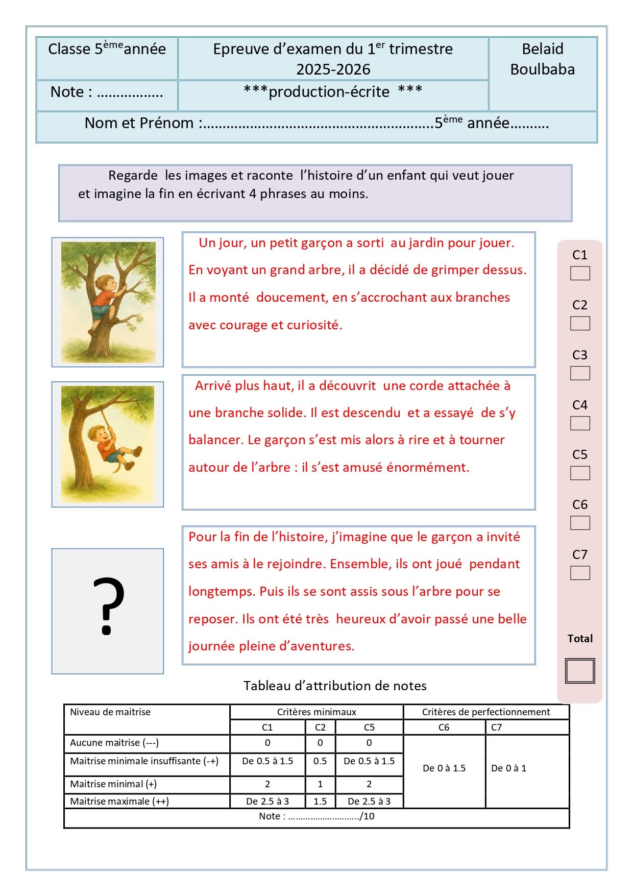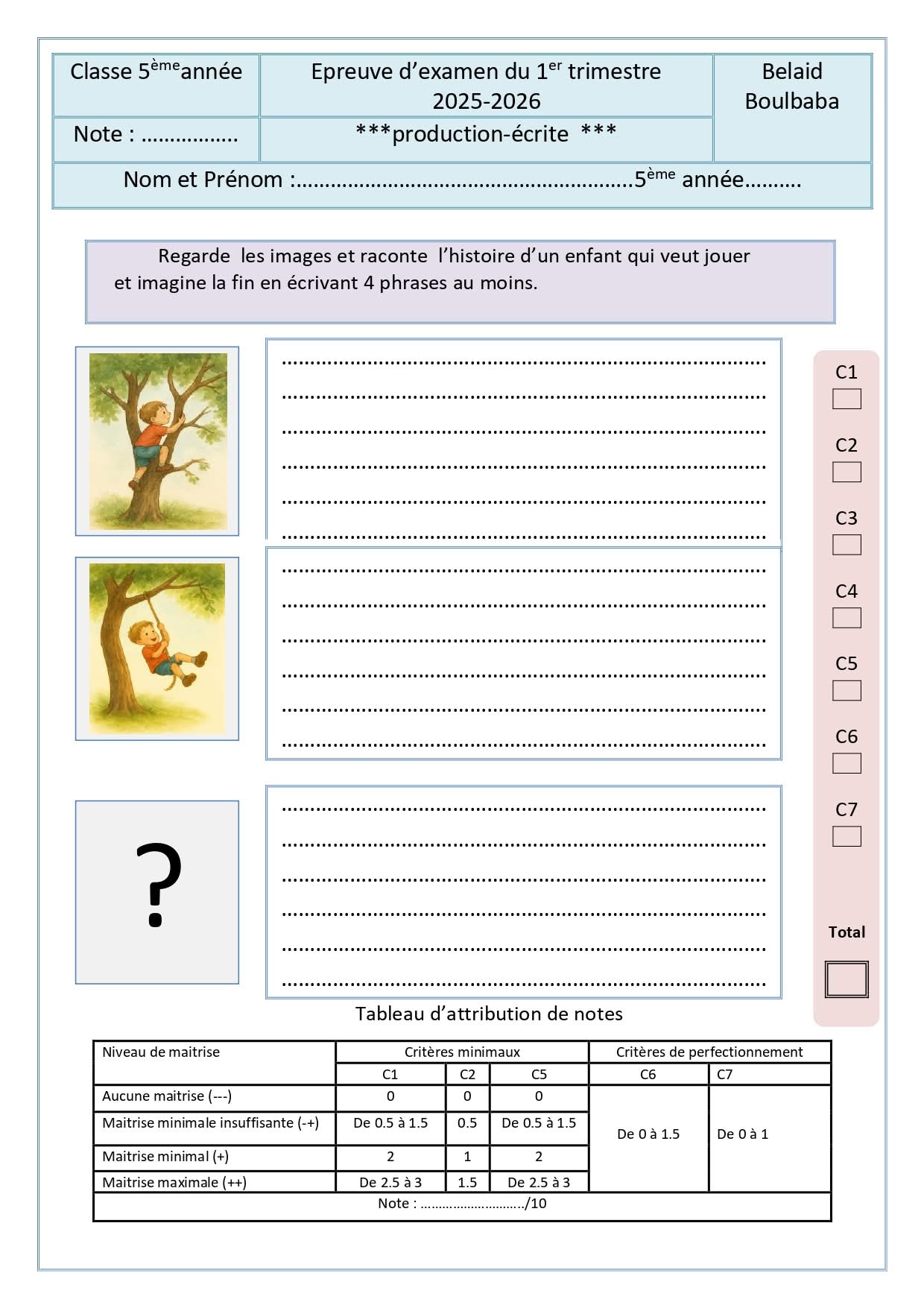 إمتحانات الثلاثي الأول مرفقة بالإصلاح المدقق في جميع المواد لتلاميذ السنة الخامسة 5️⃣