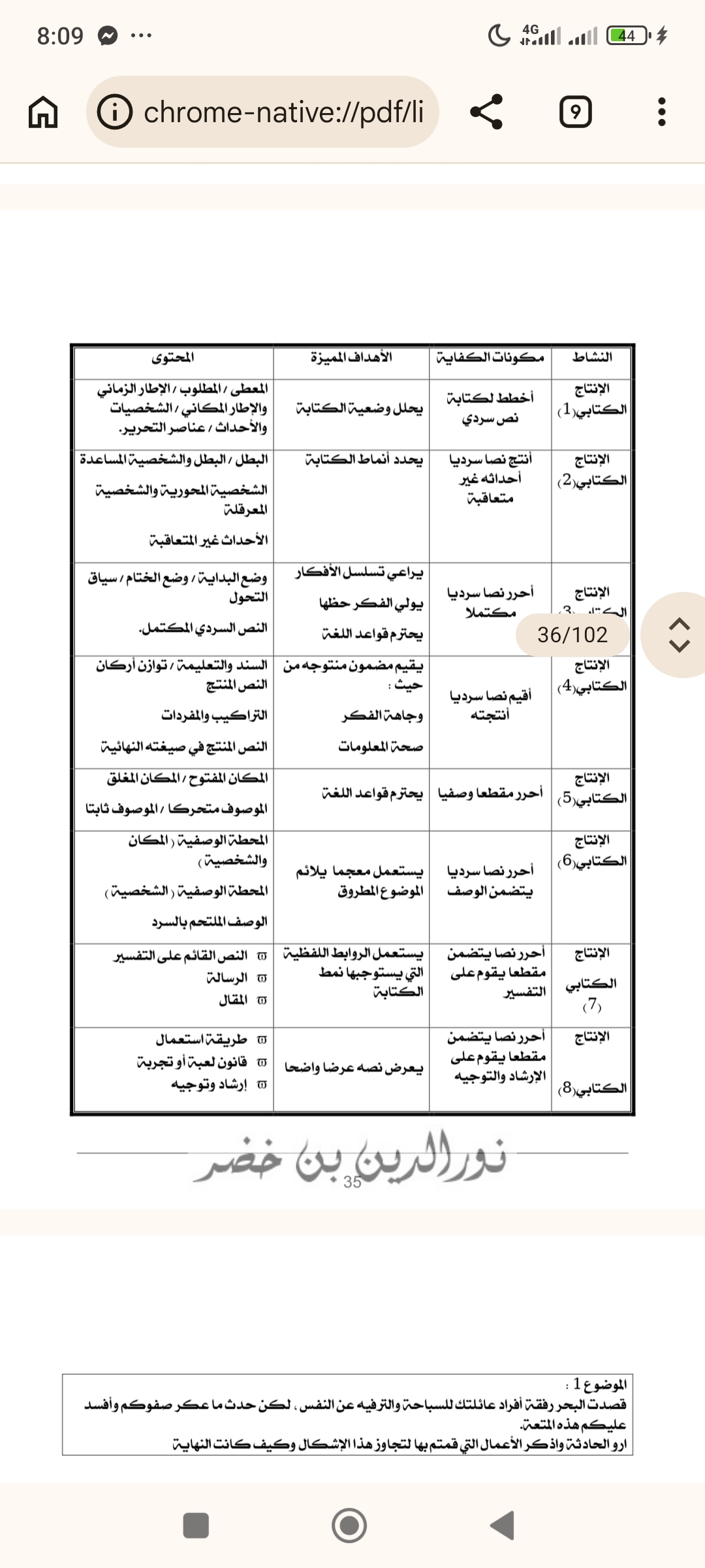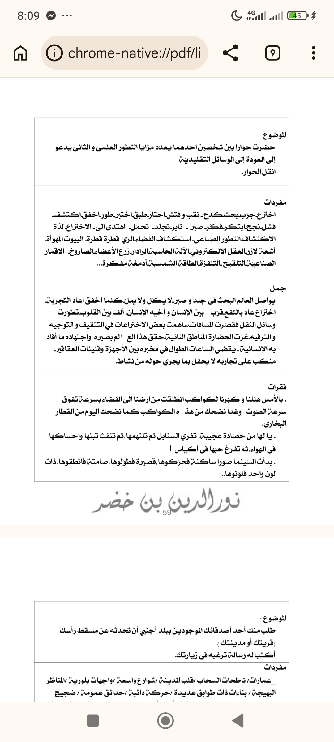 ولا شكّ أنّ هذا الكتاب يعكس خبرة الأستاذ نورالدين بن خضر في الميدان التربوي، وحرصه الكبير على مساعدة التلاميذ على النجاح والتفوق. فقد بذل جهدًا واضحًا في إعداد محتوى هادف يجمع بين الفائدة والمتعة، ويجعل من الإنتاج الكتابي مهارة سهلة يمكن إتقانها بالممارسة.