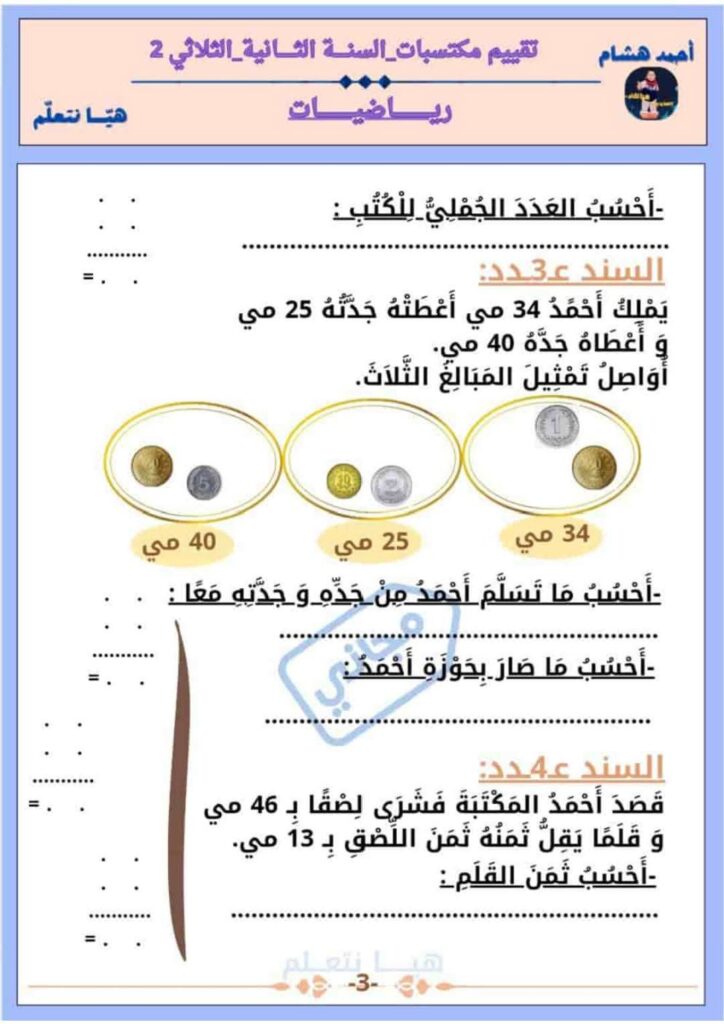 تقييمات متنوعة و مرفقة بالإصلاح في جميع المواد الثلاثي الثاني لعصافير السنة الثانية 2️⃣ كتاب تعلم مع أحمد-السنة الثانية-ثلاثي 2-أحمد