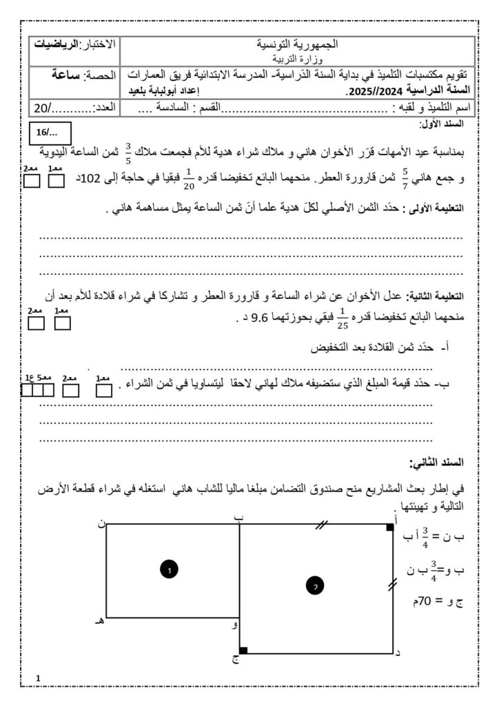 تقويم مكتسبات التلميذ في بداية السنة لتلاميذ السادسة 6️⃣ في الرياضيات مرفقة بالإصلاح